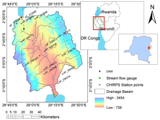 The RRB is a strategically important transboundary watershed in the Great Lakes region, covering an area of approximately 5253.97 km2. It is shared by three countries: Rwanda and Burundi from the northeast to the southeast and the Democratic Republic of the Congo from the northwest to the southwest (Figure 1). The RRB serves as a crucial hydrological feature in this region, draining water from Lake Kivu and feeding into Lake Tanganyika through the Ruzizi River, which forms the southern and northern boundaries of the basin. The selection of this basin for our study is motivated by its transboundary significance, hydrological importance, and unique environmental challenges.