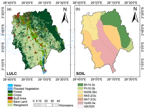 Spatial data for this research were primarily derived from a Digital Elevation Model (DEM) obtained from HydroSHEDS (https://www.hydrosheds.org/, accessed on 5 February 2024) with a resolution of 90 m, chosen to optimize computation time in the HRUs processing for SWAT. This DEM facilitated the determination of subbasin parameters such as slope gradient, slope length, elevation bands, and the stream network. A multispectral image from Landsat 8, ensuring less than 10% cloud coverage, was sourced via the USGS Earth Explorer platform (https://earthexplorer.usgs.gov/, accessed on 14 January 2024) to supplement the spatial dataset. This imagery was pivotal in developing a comprehensive Land Use Land Cover (LULC) map through a detailed supervised classification process in ArcGIS 10.8.2 (Figure 2a). A soil map from the FAO’s official website, accessed on 14 January 2024 (https://www.fao.org/soils-portal/en/ https://earthexplorer.usgs.gov/, accessed on 14 January 2024), was also processed with ArcGIS 10.8.2 (Figure 2b) for integration into the SWAT model, enriching this study’s spatial analysis framework.