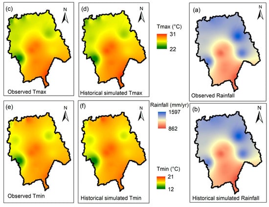 The spatial distribution of the ensemble mean annual rainfall and temperature across the Ruzizi watershed for the period 1983–2014 was analyzed using both observed and simulated data (Figure 3) to assess the reliability of the GCMs and the effectiveness of bias correction. The maps showed consistent patterns for mean annual precipitation, minimum temperature (Tmin), and maximum temperature (Tmax). For rainfall (Figure 3a,b), the upper, eastern, and western regions of the watershed, characterized by higher elevations, received more rainfall (1337 to 1582 mm) compared with other areas. This distribution pattern was consistent in both observed and modeled data, highlighting the models’ accuracy in capturing the watershed’s hydroclimatic dynamics. In terms of temperature distribution, both observed and simulated data (Figure 3c,d for Tmax and Figure 3e,f for Tmin) displayed similar spatial patterns. Tmax ranged from 23 °C to 31 °C, and Tmin ranged from 12 °C to 20 °C. Higher temperatures were found in the lower and mid-lower regions of the watershed, while cooler temperatures prevailed in the elevated eastern and western sections. This temperature gradient reflects the influence of elevation on the watershed’s thermal regime.