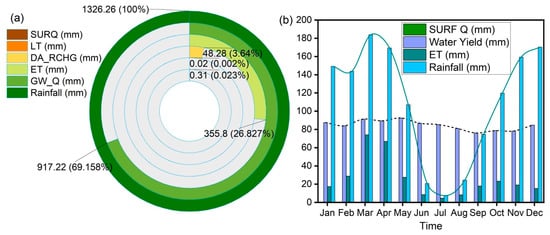 The SWAT model’s simulations provide a foundational baseline and forward-looking annual and monthly estimates of water balance components, which are crucial for understanding hydrological dynamics within the watershed. Figure 5 elucidates the mean annual simulated water balance components and the average monthly basin values (Figure 5b) derived from the baseline model execution spanning 1987–2020, correlating these components directly with precipitation levels. Consequently, the analysis delineated an average annual precipitation of 1326.26 mm from 1987 to 2020 (Figure 5a). Of this, 26.827% (equivalent to 355.8 mm) was attributable to evapotranspiration (ET) losses within the watershed. The groundwater return flow (GW_Q) constituted 69.158% (917.22 mm) of the annual rainfall, juxtaposed with a minuscule surface runoff (SURQ) rate of 0.023% (0.31 mm), alongside a 3.64% (48.28) recharge to the deep aquifer, and 0.002% (0,02 mm) to lateral flow.