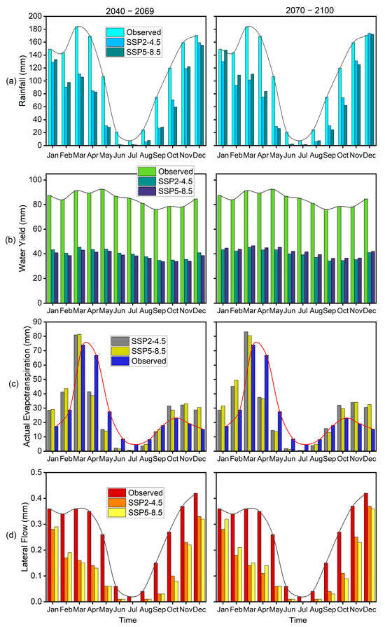 The primary water balance components within the watershed were evaluated under projected monthly climate conditions, focusing on evapotranspiration (ET), lateral flow, and water yield, crucial parameters predicted by the SWAT model for effective water management and planning in the study area. The mean monthly rainfall (Figure 6a) was also examined, revealing a consistent decrease across all months under SSP2-4.5 and SSP5-8.5 scenarios compared with the baseline period (1983–2020).