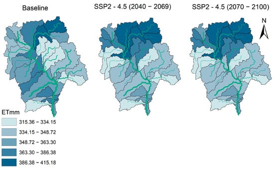 The analysis of spatial distribution for mean annual evapotranspiration (ET) and water yield across the Ruzizi watershed was meticulously conducted for the baseline period (1987–2020) and projected into future periods (2040–2069 and 2070–2100) under both SSP2-4.5 (Figure 7 and Figure 8) and SSP5-8.5 climate scenarios (Figures S1 and S2), utilizing the SWAT hydrological model. Under the SSP2-4.5 scenario, the investigation unveiled a distinct spatial variation in mean annual ET and water yield patterns between the baseline and future periods. The baseline distribution showed a high ET around the west and the northwestern part of the Ruzizi basin, ranging from 349 to 425 mm, whereas the projected future scenarios suggested minimal deviations to the north relative to baseline figures. Consequently, the distribution between the mid-term (2040–2069) and far-term (2070–2100) future periods displayed remarkable consistency for WYLD. According to the results depicted in Figure 8 and Figure S2, the eastern sector of the watershed experienced a higher water yield (WYLD) during the baseline period, a trend that is anticipated to shift towards the northeastern quadrant under future scenarios.