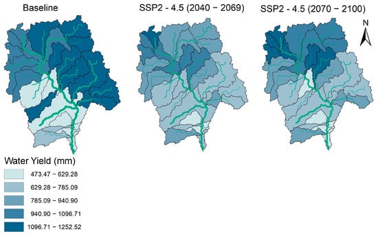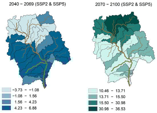 The calibrated and validated SWAT model was used to conduct a detailed scenario analysis to evaluate the impacts of climate change on hydrological processes within the RRB. This analysis compared historical baseline conditions (1983–2014) with projections under two Shared Socioeconomic Pathways (SSPs): SSP2-4.5 (middle of the road) and SSP5-8.5 (high emissions), covering mid-term (2040–2069) and far-term (2070–2100) periods. These scenarios offer a range of plausible futures based on varying levels of greenhouse gas emissions and socioeconomic developments, which are critical for assessing potential impacts on regional hydrology []. Initially, the SWAT model simulated historical baseline conditions using past climate data. This phase established a reference point for assessing future changes. Model inputs included observed precipitation and temperature collected from the CHIRPS dataset. Outputs provided baseline data on key hydrological components such as streamflow, water yield, and runoff, which were used to benchmark against future scenarios.