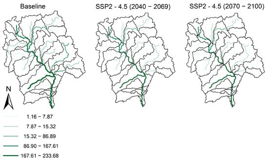 Maps illustrating the flow distribution across the watershed reaches, comparing historical simulations (1983–2020) with projections for the mid-future (2040–2069) and far-future (2070–2100) periods under the SSP2-4.5 scenarios.
