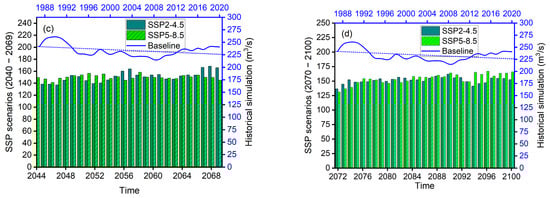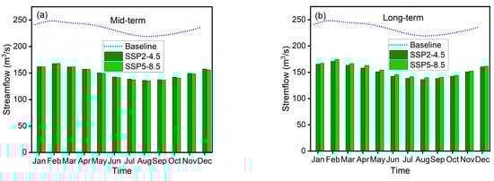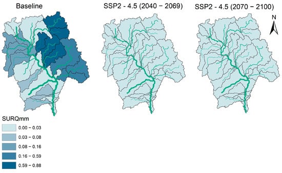 Furthermore, an analysis of mean annual flow rates (Figure 11c,d) for both future periods under each scenario revealed a decrease compared with the historical maximum mean annual discharge recorded in 2008 (213.96 m3/s). This anticipated reduction in streamflow could significantly impact the hydrological regime of the RRB, with potential implications for water resource management, ecosystem services, and climate resilience strategies. These findings underscore the necessity for adaptive management approaches to mitigate the adverse effects of climate change on river discharge patterns and to ensure sustainable water resource utilization within the basin.