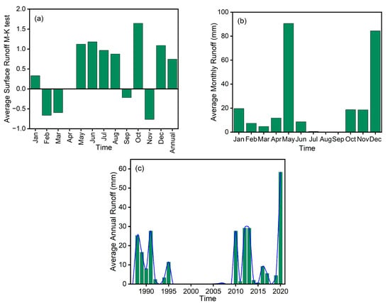 (a) Mann–Kendall Trend for monthly surface runoff (1983–2020), (b) Monthly and (c) Annual surface runoff dynamics for the baseline period (1983–2020).