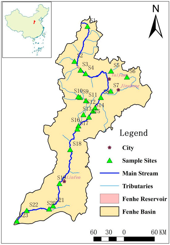 Samples were collected from 23 sampling points in the Fenhe River Basin, including the river source, downstream of major cities, reservoirs, and densely populated livestock farming areas, the confluence with the Yellow River, and major tributaries (Figure 1). Surface water and sediment samples were gathered during the dry season (November 2019) for analysis.