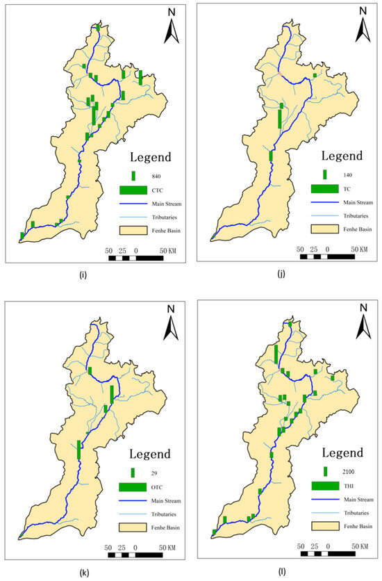 The fitting equations of the standard curves for the antibiotics had R2 values greater than 0.995. The detection limits for surface water ranged from 0.01 to 6.25 μg/L and for sediment from 0.01 to 7.89 μg/kg. During the detection process, intermediate points on the standard curves were rechecked, and blank, parallel, and matrix-spiked samples were included for quality control. The concentrations of blank samples were below the detection limits, and the concentration deviations of the rechecked points did not exceed 20% to verify instrument stability. The relative deviation of the parallel samples’ measurements should be less than 30%, and the recovery rates of the matrix-spiked samples should be controlled between 40% and 150%.