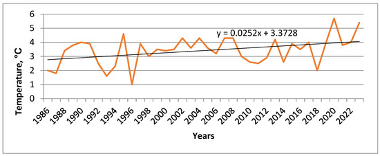 However, if we look at the trend in the data, we will notice that the average annual temperature fluctuates, with a significant increase of up to 4.6 degrees last year, suggesting that the actual data vary significantly and may deviate from the linear trend predicted by the equation. This may indicate the nonlinearity of climate change in Sergeyevka (Figure 2).