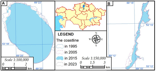 Map of changes in the shorelines of Lake Kopa (A) and Shagalaly reservoir (B).