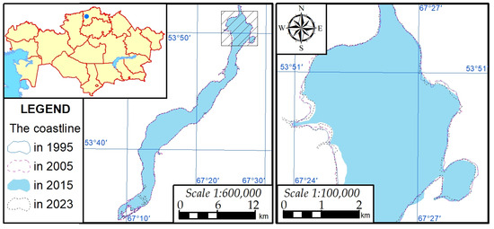 Map of changes in the shorelines of Lake Saumalkol.