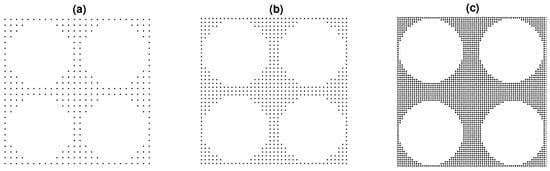 The uniform distribution of SPH particles inside the porous medium (filled dots) for three different numerical resolutions: (a) N = 335,532, (b) N = 751,894, and (c) N = 2,998,387. The empty circular zones represent the grains of the substrate.