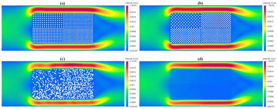The velocity field through the channel at the pore scale for three different heterogeneous porous substrates as compared with a similar simulation at the REV scale is displayed in Figure 4. The heterogeneity of the porous substrate is constructed by joining four matrix blocks with different grain geometry and porosity. The flow structure appears to be qualitatively similar in all cases and essentially independent of the details of the porous layer (see Figure 4a–c), while the same is true when comparing the REV-scale flow field with any of the pore-scale simulations. However, there are some quantitative differences. For example, the maximum velocity along the clear zones on both sides of the porous substrate is larger in Figure 4c for random arrays of grains ( m s−1) compared to Figure 4a,b for uniformly arranged grains, where m s−1. In contrast, at the REV scale, the maximum velocity along the clear zones is somewhat smaller (see Figure 4d), where m s−1.