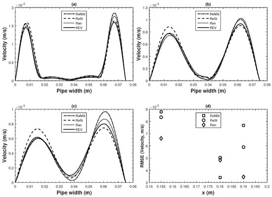 The cross-sectional velocity profiles at different stations close to the exit of the channel are displayed in Figure 5 for the same pore- and REV-scale simulation results shown in Figure 4. In particular, Figure 5a–c show the profiles at m, m, and m from the inlet plane, respectively. The heterogeneity of the porous layer affects the wave-like form of the velocity profile, which looks quite asymmetric compared to the almost symmetric form obtained for flow across a homogeneous substrate [11]. This difference in the peak velocities along the dim yellow and green streams between the right border of the substrate and the exit plane of the channel is a signature of the dependence of the flow on the non-uniform porosity and geometry of the substrate. However, in spite of differences in porosity when the grains are distributed in regular staggered arrays, the velocity profiles look much more symmetric compared to the other two geometries. Evidently, the geometric arrangement of grains in the heterogeneous porous medium influences the flow behavior through the channel. Moreover, Figure 5d displays the RMSEs between the pore- and REV-scale velocity profiles. In general, the errors are smaller than m s−1, with a tendency to be even smaller when compared with the velocity profile resulting from the fluid passage through a heterogeneous porous substrate with a random distribution of grains. Lai et al. [12] performed Lattice Boltzmann calculations for the flow of water across a channel with a homogeneous porous layer in its central core, finding that for relative heights of the porous medium , the difference in the mean mainstream velocity between the REV and pore scales is actually insignificant because most of the water flows through the clean zones adjacent to the porous layer and, therefore, the resistance of the porous substrate on the flow is negligible. However, when , the difference between both scales becomes larger as increases. In particular, they found that the maximum deviations can be as large as ∼27% when . In the present model, , and the differences in mean velocity along the channel between the REV and the pore scale are always less than about 0.01% for the three cases reported. This error is, however, similar to the one encountered when comparing the velocity profiles close to the channel exit (see Figure 5).