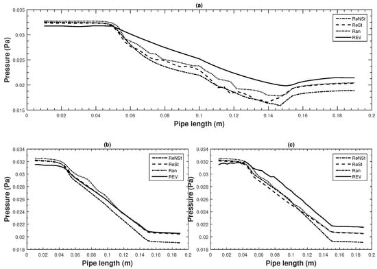 An inspection of Figure 6a shows that the pressure drop predicted by the REV-scale simulation exhibits maximum deviations from any of the three pore-scale predictions in the region within the porous substrate. This is due to the very nature of the REV method, which does not aim to detail the internal phenomenology of the porous medium, but rather, models the effect of a porous medium as a homogeneous medium. In contrast, the pressure losses along the clear zones (Figure 6b,c) show little differences between the REV- and pore-scales results. Also, from Figure 6a, it follows that the pressure decay within the porous medium is not smooth due to its heterogeneity. This is a big difference with the REV-scale, where the porous matrix is assumed to be homogeneous. In spite of these small quantitative differences, these results show that the REV scale captures, with a fairly good accuracy, the trends of the pressure losses within a heterogeneous porous medium, with RMSEs that are less than about 0.3% in Pa.