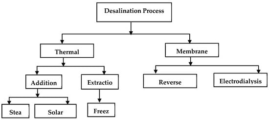 Various methods of desalinating seawater are being identified and investigated to increase the amount of available potable water. The desalination process is classified into two based on the process’s physical characteristics []. The two categories are membrane technology and thermal technology. Thermal technology uses the concept of vaporization/evaporation to separate salinity from water, whereas membrane technology uses a filtering device to produce potable water from saltwater. Thermal technology is subdivided into multistage flash distillation, freeze separation techniques, multiple effect distillation, solar still distillation, and vapour compression. Membrane technology is divided into reverse osmosis (RO) and electro dialysis procedures (Figure 1).