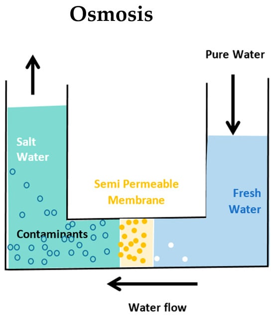 According to Greenlee, et al. [], Osmosis is the process by which water moves from a less concentrated saline solution across a semi-permeable membrane to a region with a higher concentration of saline solution. A semi-permeable material will allow only pure water to pass through and disallow saline liquid. A semi-permeable membrane allows water to pass through when there is pure water on one side and a salt solution on the other while preventing the passage of salt. Greenlee, et al. [] in their study further elucidated the concept of osmotic pressure within the realm of reverse osmosis (RO) by characterizing it as the utmost vertical disparity in water levels as water migrates from a region of lower solute concentration through a semi-permeable barrier to an area of higher concentration. To ensure that the solution strength is balanced, reverse osmosis changes the direction of water flow when the pressure applied is higher than the osmotic pressure. Desalination is accomplished by the system’s attempt to keep the equilibrium in position by letting water move from the clear water compartment to the salt solution compartment. This dilutes and equalizes the concentration on both sides of the membrane. Osmosis may produce a rise in the salt solution level, which will keep rising until the salt solution pressure in the water column rises to the point where the force of the water column stops the inflow. Osmotic pressure is the water level equilibrium point measured in terms of the water pressure exerted on the membrane (Figure 4).