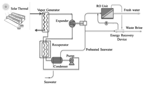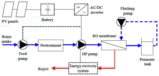 Azevedo [] concluded that the PV-RO system as shown in Figure 5 has been regarded as one of the most reliable solutions for desalination driven by renewable energy, particularly for rural places given that both PV and RO are modular and easily accessible. The modularity of the system, which has reduced the cost of production through economies of scale, has allowed small-scale systems to be created by directly connecting the DC output of PV modules to DC pumps and electronics, which in turn increases the system’s overall efficiency by 5% to 10% by preventing losses in DC-AC power conversion and AC-DC rectification [].