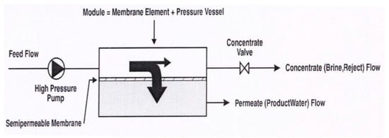Raju and Ravinder [] compared the expenses linked to brackish water desalination. The desalination plant for 230 ppm brackish water in Jordan costs a low 0.26 USD/m3, whereas the plant for 5000 ppm brackish water in Florida costs a low 0.27 USD/m3. Their study revealed that comparable systems employing varying total dissolved solids (TDS) levels generally exhibit notable cost variations. According to Tzen and Morris [], desalinating 10,000 parts per million brackish water with conventional energy sources costs 0.43 USD/m3, but in a similar scenario, employing renewable energy sources can cost as much as 10.32 USD/m3. At the initial stage, the desalination cost using traditional energy sources like gas, oil, or electricity is initially cheaper than using renewable energy. However, renewable energy proves to be more cost-effective in the long run. The RO desalination process, as seen in Figure 3, has gained popularity in recent years due to the decreasing cost of membranes. RO was mostly employed for brackish water desalination a few years ago but because of its reduced energy requirements, it has recently emerged as the most widely used technique for desalinating varied types of water. Consequently, larger facilities that can produce in excess of 320,000 m3 per day are now using RO technology.