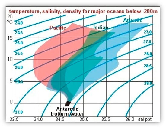 The quality and volume of RO waste brine are influenced by the feed water quality, pre-treatment approach, desalination process, water recovery rate, and waste disposal method []. Omerspahic, et al. [] reported in their study that during the feedwater pretreatment phase of membrane desalination, chemicals such as acids, biocides, antiscalants, antifoams, and corrosion inhibitors are commonly used, impacting the physicochemical composition of the resulting brine. Additionally, environmental factors like temperature, pH, and ionic strength can influence the concentration of pollutants in desalination brine. The quality of the brine is also affected by the membrane pore size used in the process [,]. According to Jones, et al. [], the desalination plant’s capacity and the water recovery rate, which is the proportion of freshwater generated relative to the total volume of feed water used, determine the quantity of brine produced. Better quality feed water leads to a greater recovery rate, as higher salinity levels in the feed water will result in more concentrated brine if the water recovery rate stays the same. As the water recovery rate increases, the amount of brine produced is reduced and is more concentrated. Even though RO is dependent on hydraulic pressure and does not alter the temperature of the seawater it processes, it requires a number of extremely intricate pre-treatment steps, such as the addition of coagulants and antiscalants, which have the potential to alter the pH of the water and produce brine with a salinity that is significantly higher than ambient water []. According to the WHO—Geneva [], the allowable salt content in water is 500 ppm and 1000 ppm in special cases, but most water available on earth has a maximum salt content of 10,000 ppm. Seawater usually contains salts (about 35,000 ppm to 45,000 ppm of total dissolved salts). Extreme brackishness will lead to taste and stomach problems. Desalination systems are designed to solve these problems by purifying seawater or brackish water and providing clean water with allowable limits of 500 ppm or less []. The density of freshwater is 1.00 (grams/mL or kg/L), which can be increased by adding salt. The more salty the water is, the higher its density. Water will expand and become less dense when it becomes hot. The colder the water, the higher the density. Figure 5 shows the relationship between temperature, salinity and density. The Pacific Ocean has the lightest water with a density of less than 26.0; the Atlantic has the densest water, between 27.5 and 28.0. Antarctic bottom water is densest in the Pacific and Indian Oceans, but not the Atlantic []. Dissolved gases in seawater are always in equilibrium with the atmosphere, but their relative concentration depends on the solubility of each gas, as well as on salt content and temperature. As the salt content increases, more water molecules are immobilized by salt ions, which reduces the amount of dissolved gas. As the water temperature rises, the mobility of the gas molecules increases, and facilitates their discharge from the water, which reduces the quantity of gas that dissolves. According to Mustafa Omerspahic et al., desalination brine effluents include significant levels of Cl− and Na+, as well as other ions such as Ca2+, Mg2+, and SO2− []. Several studies have been published on the presence of heavy metals such as copper (Cu) in desalination brine effluents and seawater. Brine discharges from RO often include metals in trace quantities, such as iron (Fe), nickel (Ni), chromium (Cr), and molybdenum (Mo). Furthermore, chemicals such as biocides, surface-active agents, anti-scale additives, and solid residues from filter backflushing may be present in the effluent discharge on a continuous or periodic basis, posing a risk to the environment. Brine effluents from RO desalination plants not only have a high salt content but typically also contain compounds from the desalination process, such as phosphonate-based antiscalants and ferric sulphate (or alum)-based coagulants []. Table 2 shows the salt ion content of different seawater sources.
