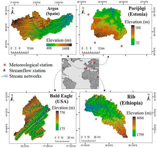 We used four study catchments with different sizes, land use, topography, and climatic conditions as our study areas: Argos (Spain), Porijõgi (Estonia), Rib (Ethiopia), and Bald Eagle (USA) (Figure 1).