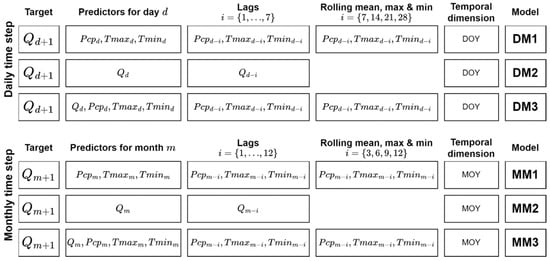 Overview of the three daily and three monthly Random Forest models with different feature sets. Abbreviations: DM1, DM2, and DM3, RF models at a daily time step; DOY, numeric day of the year; i, lag days or months; MM1, MM2, and MM3, Random Forest models at a monthly time step; MOY, numeric month of the year; Pcpd, average precipitation on day d; Pcpm, average precipitation in month m; Qd, average streamflow on day d; Qd+1, streamflow prediction for the next day; Qm, average streamflow in month m; Qm+1, streamflow prediction for the next month; Tmaxd and Tmind, maximum and minimum air temperature on day d; Tmaxm and Tminm, maximum and minimum air temperature in month m.