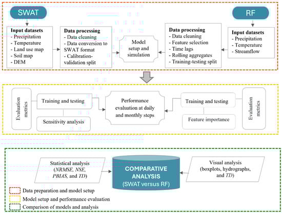 Workflow used to compare the performance of SWAT and RF models. Abbreviations: DEM, digital elevation model; NRMSE, normalized root-mean-square error; NSE, Nash–Sutcliffe efficiency coefficient; PBIAS, percentage of bias; RF, Random Forest; SWAT, Soil and Water Assessment Tool; TD, Taylor diagram.