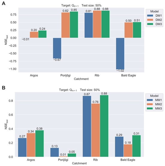 Nash–Sutcliffe efficiency (NSE) for the (A) daily and (B) monthly streamflow predictions (during the testing period) for the Random Forest models.