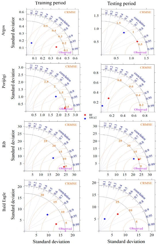 To compare RF with SWAT, we focused on the daily DM3 model and the monthly MM3 model, which included all predictors and were the best-performing RF models. For daily predictions, RF outperformed SWAT, with higher correlation coefficients and lower CRMSE values between the observed and modeled values across all catchments in both the training and testing periods (Figure 5). SWAT’s predictions on a daily time step generally displayed lower correlations and larger deviations from the observed data, indicating a greater difference between actual and predicted flows. Moreover, daily RF generally demonstrated strong performance based on the other statistical metrics (NSE > 0.5, NRMSE < 7%, PBIAS ≤ ±5; Table 4). In most cases, SWAT tended to overestimate the daily streamflow, especially for Bald Eagle during testing (PBIAS = 27.4%) and Porijõgi during training (PBIAS = 22.6%). Conversely, RF provided more reasonable predictions, with only slight over- or underestimation in a few cases. This trend was further supported by visual analysis of the hydrographs (Figure 6), where the RF model demonstrated better performance in capturing both peak- and base-flow levels.
