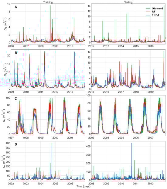 We evaluated the computational efficiency of SWAT and RF by measuring the total time required to complete a simulation. On a single-core Windows computer with a 3.60 GHz processor and 64 GB of RAM, the average time needed for a single simulation in SWAT ranged between 78 s (on a monthly time step) to 90 s (on a daily time step). Achieving satisfactory NSE values in SWAT demanded a considerable amount of time: 10 to 14 iterations, each requiring 1500 to 2000 simulations. The time needed for SWAT simulations, therefore, ranged from approximately 72 h for Porijõgi on a monthly time step to approximately 241 h for Bald Eagle on a daily time step (Figure S4A). In contrast, the RF models exhibited remarkable computational efficiency compared to SWAT. With a maximum training time of less than 12 s for the daily time step (Figure S4B), testing RF on both daily and monthly time steps required less than 12 s. It is essential to highlight that our comparison primarily focused on the training and testing phases of the models; nevertheless, developing a fully functional SWAT model demanded considerable overall time.
