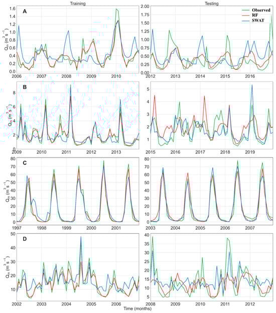 Hydrographs for comparison of the observed monthly streamflow and the predictions by the Random Forest (RF) MM3 model and the Soil and Water Assessment Tool (SWAT) model in the (A) Argos, (B) Porijõgi, (C) Rib, and (D) Bald Eagle catchments.