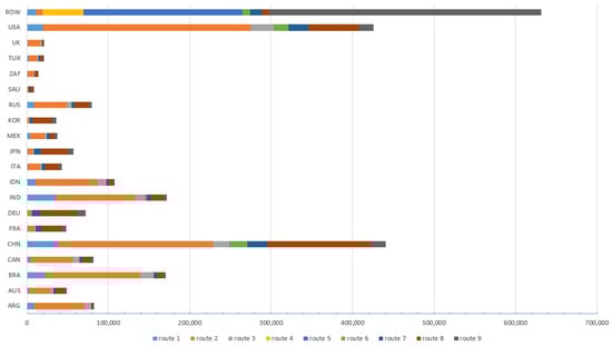 The results of the virtual water decomposition share of the nine trade routes for the G20 countries and ROW in 2016 are shown in Figure 1. This figure shows that regarding the total virtual water volume, the ROW, China, and the USA rank in the top three in order, while SAU has the lowest volume of virtual water, followed by South Africa and Turkey.
