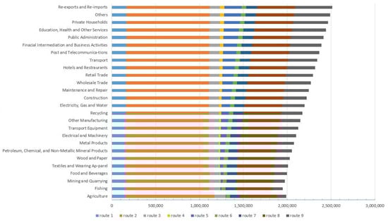The results regarding the virtual water decomposition share of the nine trade routes at the sectoral level are displayed in Figure 2. Overall, the re-exports and re-imports sector has the largest virtual water trade, confirming that with the gradual increase in trade interactions between countries, the virtual water in various forms of imports, processing, and re-exports in cross-border trade has increased, while fishing has the smallest virtual water trade. All sectors have the largest share of virtual water decomposition on route 2 and the smallest on route 4, and there is not much of a difference in the proportion of virtual water decomposition among sectors on route 1, 3, 6, 7, and 8.