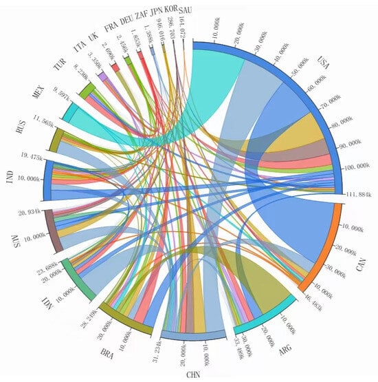 Due to the large virtual water flow of the ROW, it is not convenient to analyze its virtual water transfers with G20 countries, so the virtual water transfers measured in Figure 3 do not include the ROW. As shown in Figure 3 below, after excluding the data from the ROW, the countries whose virtual water outflow is smaller than their virtual water inflow are China, Germany, France, Italy, Japan, Mexico, South Korea, South Africa, and Saudi Arabia, meaning that China, France, Italy, Japan, Mexico, South Korea, South Africa, and Saudi Arabia have changed from “virtual water net exporters” to “virtual water net importers”. Meanwhile, Germany is still an importer of virtual water, which means that the virtual water in these countries mostly flows out to other countries outside of these 19 countries. Intuitively, it can be observed that the countries with the highest amount of virtual water are the USA, Canada, Argentina, and China, while the countries with the smallest virtual water trade volume are South Korea and South Africa, related to their economic conditions and population size. In addition, there are not many countries that import virtual water from Mexico. The virtual water flow from Mexico to the USA basically accounts for the vast majority of Mexico’s total outflow. Most of Canada’s virtual water inflow comes from the USA, and most of Argentina’s virtual water inflow comes from Brazil.