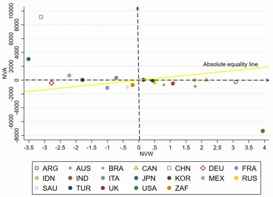 According to Equations (23) and (24), the NVA and NVW of the 19 countries are calculated. Since NVWsr and NVAsr denote the NVW and NVA from region s to region r, respectively, it is suggested that they can be both positive and negative between any two countries, and thus NVWsr = −NVWrs. Taking the NVA between Argentina and Australia as an example, when NVAARG-AUS is positive, then NVAAUS-ARG must be negative, even though they represent the same situation (the NVA between Argentina and Australia). Thus, this study exclusively focuses on the case where NVAsr < 0 and its counterpart NVWsr. The results are shown in Figure 4, where the axes are divided into four quadrants and the solid yellow line is the absolute equality line for these data.