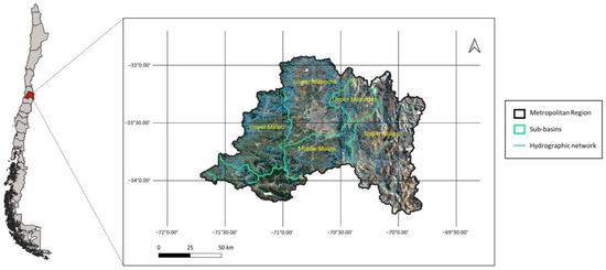 The Maipo River basin, located in central Chile, is one of the most important in the country, both from a hydrographic and socioeconomic perspective. This basin covers an area of approximately 15,304 km² and extends from the Andes mountain range to its mouth in the Pacific Ocean, crossing the Metropolitan Region of Santiago [7]. The Maipo River, with a length of approximately 250 km, is the main source of water for Santiago, supplying nearly 7 million people and supporting much of the agricultural activity in the region, especially the cultivation of fruit trees and vineyards [8,9,10]. The basin is characterized by a snow-based hydrological regime, where most of the flow is caused by the melting of snow accumulated in the mountain range during the spring and summer months [2]. However, climate change has had a significant impact on water availability in the basin, reducing snowfall and altering snowmelt patterns, which has exacerbated the region’s vulnerability to drought [11]. In addition, the basin faces pressures from intensive water use for agricultural irrigation and urban growth, which has generated conflicts between different users and challenges for the sustainable management of the resource.