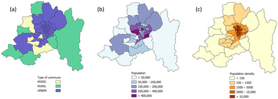 Communes of the Metropolitan Region classified into: (a) type of commune, (b) population, and (c) population density [21].