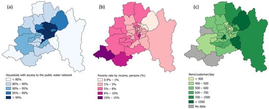 Communes of the Metropolitan Region classified into: (a) households with access to the public water network, (b) poverty rate by income, and (c) liters of water consumed per customer (family) per day [12,21].