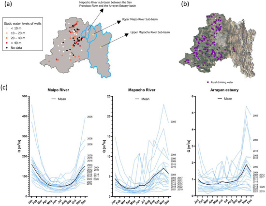 (a) Source of surface and underground water in the Metropolitan Region, (b) distribution of Rural Drinking Water (APR) systems across the region, and (c) monthly average flows of the Maipo and Mapocho Rivers and the Arrayan Estuary over the last 20 years [30,31].