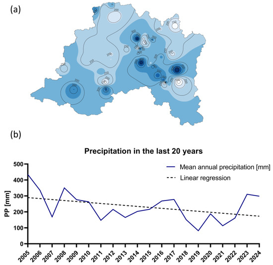 Figure 6 presents an analysis of precipitation in the Metropolitan Region. In Figure 6a, the isohyet map shows the spatial distribution of the average annual precipitation, revealing how it varies significantly across the region, with higher-altitude areas receiving more precipitation [33]. Precipitation in this area is concentrated during the winter months and is primarily caused by low-pressure fronts [33]. In Figure 6b, the average precipitation over the last 20 years is presented along with a regression line. This line suggests a decreasing trend in precipitation. In this context, numerous studies have reported a decrease in precipitation in central Chile in recent years. Some studies indicate precipitation deficits ranging from 25% to 45% over the past 15 years [34]. Additionally, the impact of anthropogenic contributions to this phenomenon has been documented [35].