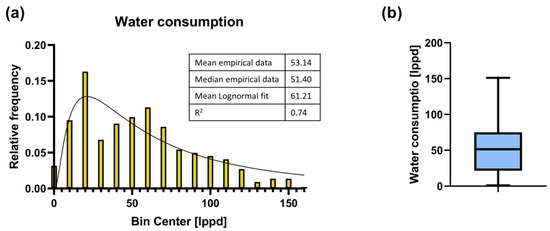 The histogram shown in Figure 7a exhibits a multimodal distribution with peaks at several intervals. The highest frequency value is observed in the bin centered at 20 L per day, with a frequency of approximately 0.16. The distribution shows some asymmetry, with a higher concentration of data in the lower value bins (0 to 60) and a gradual decrease in frequency as the bin values increase. This suggests that the data tend to be more clustered at lower water consumption values. Additionally, a lognormal model was fitted to the data, which presented an R² value of 0.74, indicating the best fit achieved. The median and mean of the data are relatively close with the mean being slightly higher, which is consistent with the right skewness. Additionally, the box plot shows a wide interquartile range, suggesting a broad variability in the data.