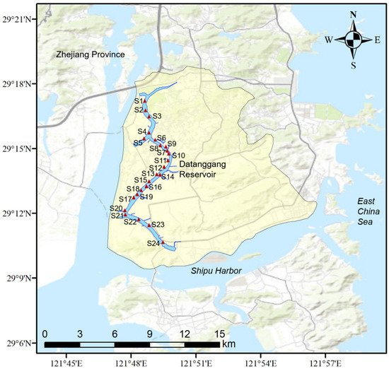 Our study area was Datanggang Reservoir (121°49′12.81″ E, 29°13′19.73″ N) (Figure 1), located in Zhejiang Province, China. Datanggang Reservoir was built by blocking the harbor during 1971–1975, and it was separated from the East China Sea by a dam. It was used to store fresh water along the coast, with the salinity less than 1‰ all year round, and was classified as a reserve source of drinking water. The length of the Datanggang Reservoir main stream is approximately 21 km, with an average water width of 300–400 m and an average water depth of 5–8 m.