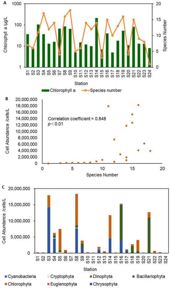 Chlorophyll a (A), species numbers (B), and cell abundance (C). Cell abundance had a significant correlation with species number (C) (p < 0.01). (A): Chlorophyll a and species numbers in sampling sites. S1 to S24 are the sampling stations. (B): The correlation between cell abundance and species number. Cell abundance had a significant correlation with species number (p < 0.01), and the correlation coefficient was 0.848. (C): Cell abundance in each site. S1 to S24 are the sampling stations.