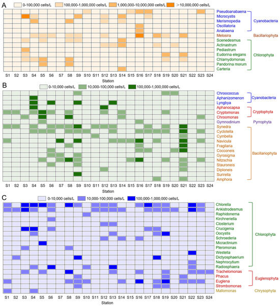 Composition of algae species at the sampling sites. (A): Species with cell abundance of more than 1,000,000 cells/L in one or one more site; (B): Cyanobacteria, Cryptophyta, Pyrrophyta, and Bacillariophyta spp. less than 1,000,000 cells/L; (C): Chlorophyta, Euglenophyta, and Chrysophyta spp. less than 1,000,000 cells/L.