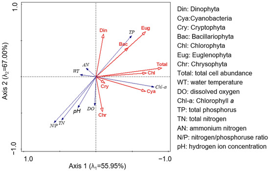 Overall, according to the RDA results, total nitrogen and total phosphorus were important regulatory factors affecting phytoplankton distribution, and total phosphorus was a crucial factor (Figure 4). The total phosphorus concentration is a crucial environmental factor affecting the total algae abundance and chl a concentration.