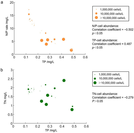 According to the correlation analysis results in Figure 5, the nitrogen-to-phosphorus ratio decreased with an increase in the total phosphorus content and a decrease in the total nitrogen concentration. Simultaneously, the total algal cell abundance increased. When the total phosphorus concentration was higher than 0.3 mg/L, the number of species was maintained at a high level and exceeded eight. The total algal cell abundance was over 10 million cells/L in waters with total phosphorus higher than 0.2 mg/L and no more than 8 million cells/L in waters with total phosphorus less than 0.2 mg/L. The density of total algal cells in water with N/P ratios > 8 was generally lower than that in water with N/P ratios < 8. In waters with total algal cell abundance over 10 million cells/L, the N/P ratios were all <8, and in the waters with N/P ratios > 8, the total algal cell abundance was less than 1 million cells/L, except for one site with a cell abundance of 3.9 × 106 cells/L.