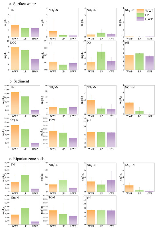 The spatiotemporal distribution of nutrients in the sediment-water-riparian soil system of the Huixian Wetland in 2019: (a) The spatiotemporal distribution of nutrients in the groundwater system; (b) The spatiotemporal distribution of nutrients in riparian soils; (c) The spatiotemporal distribution of nutrients in sediments.