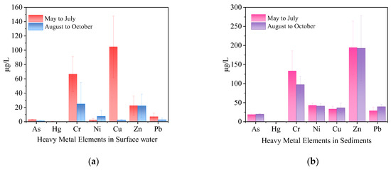 Summarizes the comparison of heavy metal content in the surface water-sediment system of Huixian Wetland from May to July and August to October in 2018: (a) Comparison of heavy metal concentrations in the surface water; (b) Comparison of heavy metal concentrations in the sediment system.