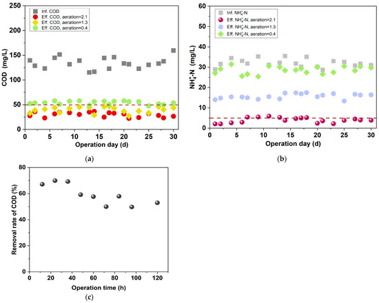 Figure 12. The performance of the BAF/AX process operating under low aeration intensity, (a) COD; (b) NH 4 + - N ; and (c) TN in effluent.