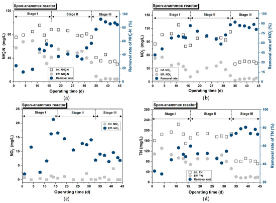 In recent years, research on the anammox process has primarily focused on treating low C/N wastewater or high NH 4 + - N and high-temperature wastewater, such as sludge digestion [26] and landfill leachate [27]. Advanced sewage treatment and recycling are effective ways to address water resource shortages, and the anammox process is recognized as a suitable option for advanced domestic sewage treatment. Usually, the NH 4 + - N concentration in wastewater after secondary treatment is as low as 30~50 mg/L, or it was usually 15~35 mg/L in municipal domestic sewage in China. However, despite being a promising and potential technology, the start-up characteristics and applicability of the anammox technology at low substrate influent concentrations remain unknown. The nitrogen removal performance of the Spon-anammox reactor at low influent concentration is shown in Figure 6. Similar to high influent concentration, the removal efficiency of NH 4 + - N and NO 2 - N were relatively low in stage I and fluctuated but increased in stage II (Figure 6a,b), if operated at low influent concentrations. At approximately half the high influent concentration, the AnAOB was not well-cultured and did not enrich rapidly in stage I, resulting in poor nitrogen removal performance. In stage II, this fluctuation was caused by reducing EBRT from 4 h to 2 h, while the increasing activity of AnAOB led to increased removal efficiency of NH 4 + - N and NO 2 - N . In stage II, the removed NH 4 + - N was around 20~35 mg/L, which was lower than that operated at the high influent concentration (26~43 mg/L). Simultaneously, the removed NO 2 - N was 22.4~40.5 mg/L. At the end of stage II, the removal efficiency of NH 4 + - N and NO 2 - N ascended to 89.1% and 73.5%, respectively, while the removal efficiency of TN climbed to 72.0%. Concurrently, the calculated ratio of NH 4 + - N / NO 2 - N / NO 3 - N was 1:1.06:0.17, according Figure 6c. Entering stage III, even under the shorter ERBT of 1 h, the removal efficiency e of NH 4 + - N and NO 2 - N persisted within the ranges of 81.3~93.6% and 78.1~92.3%, respectively. Moreover, the removal efficiency of TN remained stable at 73.0~80.6% (Figure 6d). The calculated ratio of NH 4 + - N / NO 2 - N / NO 3 - N was 1:(1.27 ± 0.12):(0.27 ± 0.03), which is close to the reported value (1:1.32:1). Based on the outcomes observed under low substrate influent concentration, the successful launch of the Spon-anammox reactor after a 44-day operational period, underscores the potential application of the anammox process in municipal wastewater treatment.